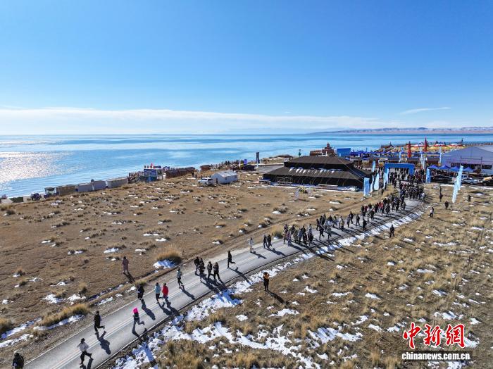 图为公众正在青海湖畔徒步。(无人机相片)中新社记者 马铭行 摄